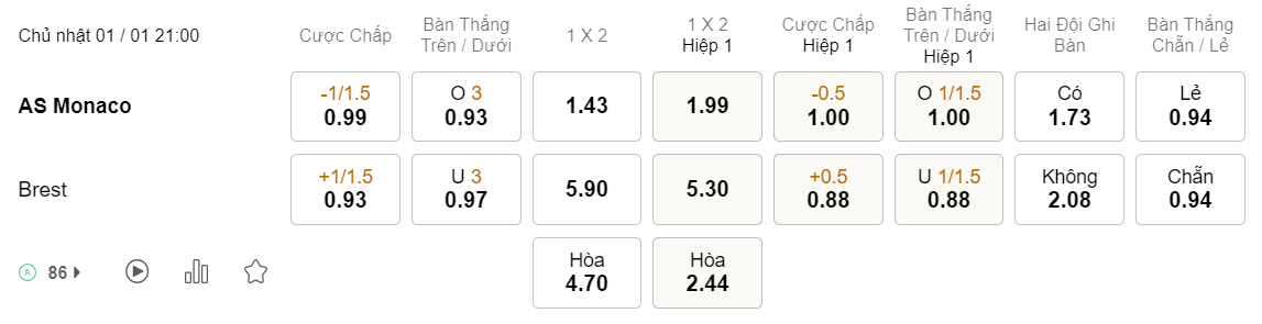 Soi kèo hiệp 1 Monaco vs Brest: 1.00*0.5*0.88