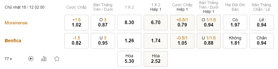 Tỉ lệ kèo Moreirense vs Benfica
