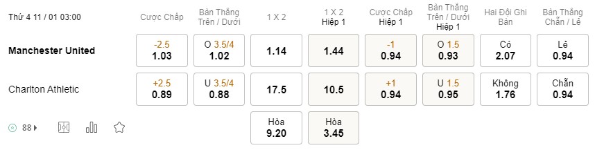 Tỉ lệ kèo MU vs Charlton