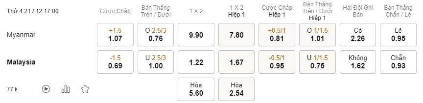 Tỉ lệ kèo Myanmar vs Malaysia