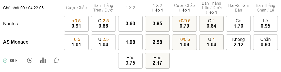 Tỉ lệ kèo Nantes vs Monaco