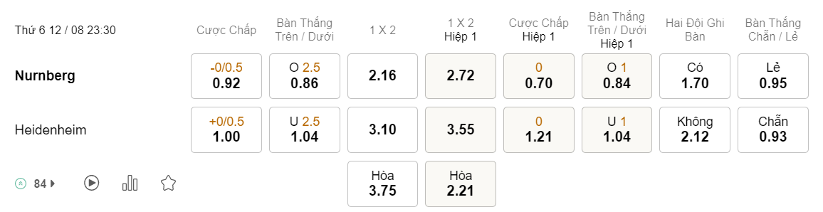 Soi kèo hiệp 1 Nurnberg vs Heidenheim: 0.70*0*1.21
