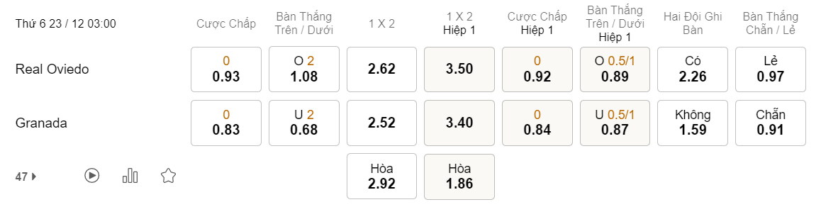 Theo thống kê, cả 3 trận đấu gần nhất Oviedo đối đầu Granada, bàn thắng được ghi nhận đều chỉ có thể xuất hiện ở hiệp thi đấu thứ 2. Vì vậy, rất có thể 45 phút đầu tiên của trận đấu này sẽ tiếp tục khép lại với kịch bản hòa không bàn thắng.