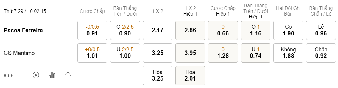Soi kèo tài xỉu Pacos Ferreira vs Maritimo: 0.90*2/2.5*1.00
