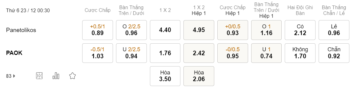 Soi kèo hiệp 1 Panetolikos vs PAOK: 0.93*0/0.5*0.95