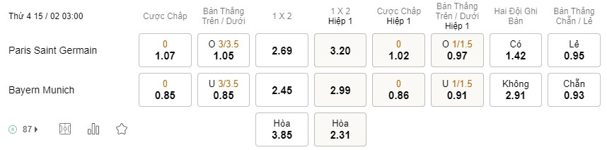 Theo thống kê, những cuộc trạm chán gần đây của hai đội đều chứng kiến khá nhiều bàn thắng được ghi. Cụ thể, 4/6 lần gần nhất PSG gặp Bayern, NHM đã chứng kiến ít nhất 3 bàn thắng xuất hiện mỗi 90 phút. Đó là lý do một số trang truc tiep bong da hd nhận định tỉ lệ nổ Tài sẽ là khá cao trong trận đấu này.