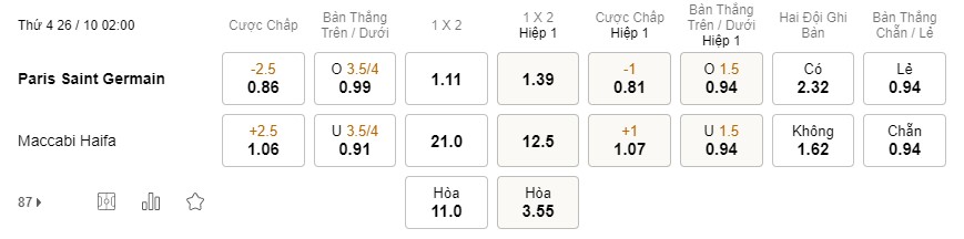 Tỉ lệ kèo PSG vs Maccabi Haifa