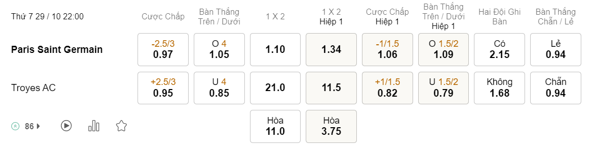 Tỉ lệ kèo PSG vs Troyes