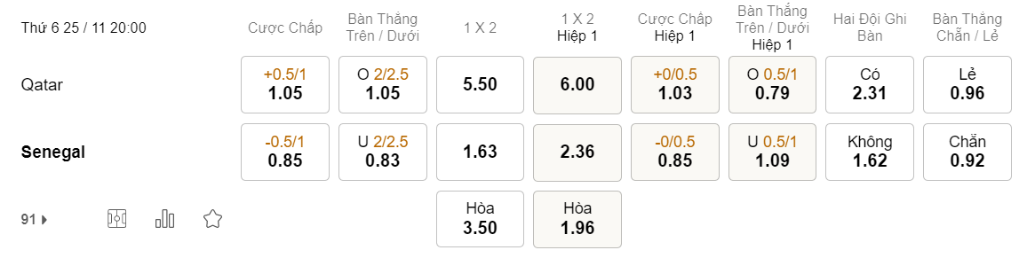 Tỉ lệ kèo Qatar vs Senegal