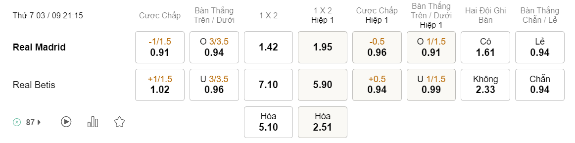 Soi kèo châu Á Real Madrid vs Betis: 0.91*1/1.5*1.02