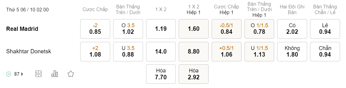 Soi kèo hiệp 1 Real Madrid vs Shakhtar Donetsk: 0.84*0.5/1*1.06