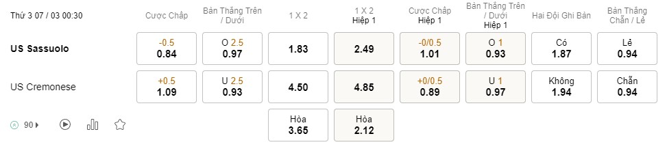 Tỉ lệ kèo Sassuolo vs Cremonese