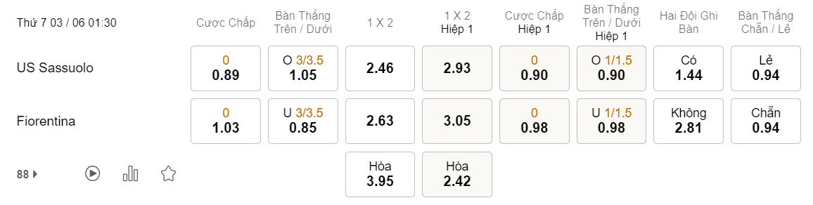 Tỉ lệ kèo Sassuolo vs Fiorentina