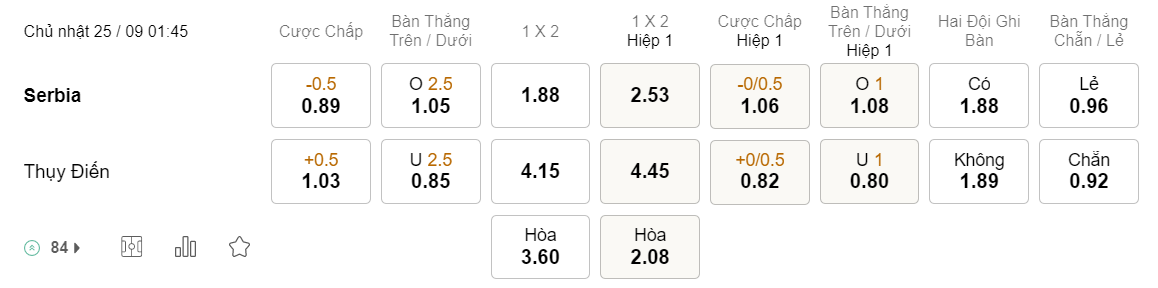 Soi kèo hiệp 1 Serbia vs Thụy Điển: 1.06*0/0.5*0.82