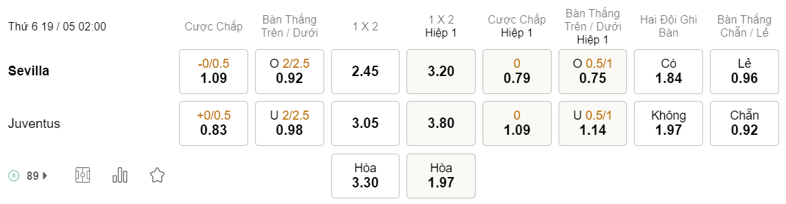 Soi kèo tài xỉu Sevilla vs Juventus: 0.92*2/2.5*0.98