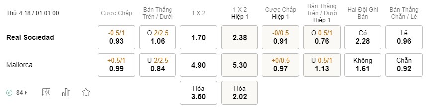 Tỉ lệ kèo Sociedad vs Mallorca