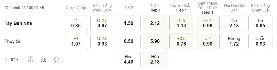 Tỉ lệ kèo Tây Ban Nha vs Thụy Sĩ