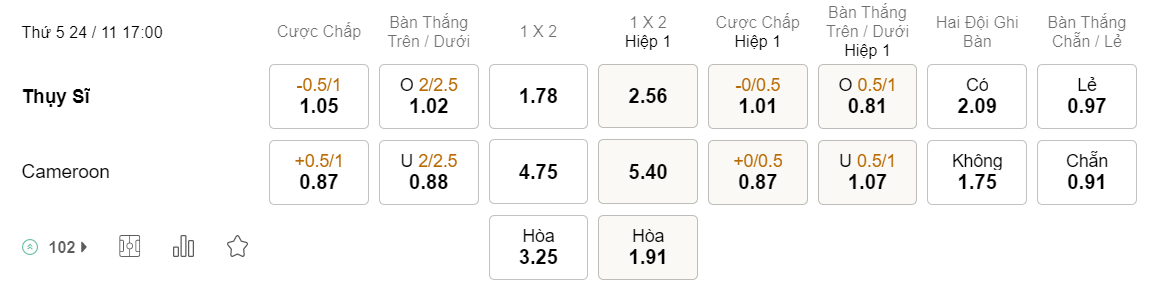 Tỉ lệ kèo Thụy Sĩ vs Cameroon