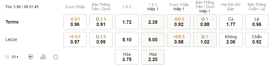 Tỉ lệ kèo Torino vs Lecce