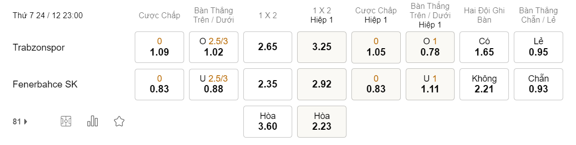 Tỉ lệ kèo Trabzonspor vs Fenerbahce