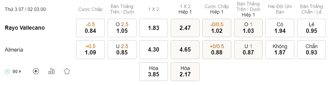 Soi kèo tài xỉu Vallecano vs Almeria: 1.05*2.5*0.85