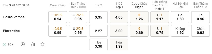 Tỉ lệ kèo Verona vs Fiorentina