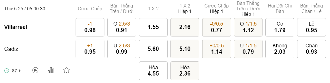 Tỉ lệ kèo Villarreal vs Cadiz