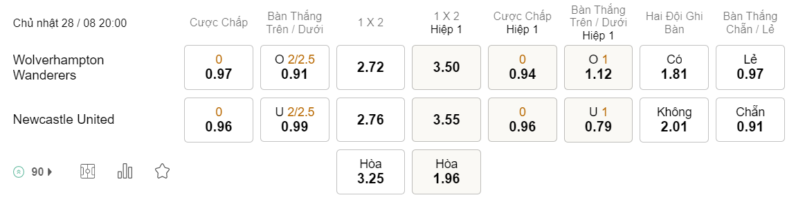 Soi kèo hiệp 1 Wolves vs Newcastle: 0.94*0*0.96