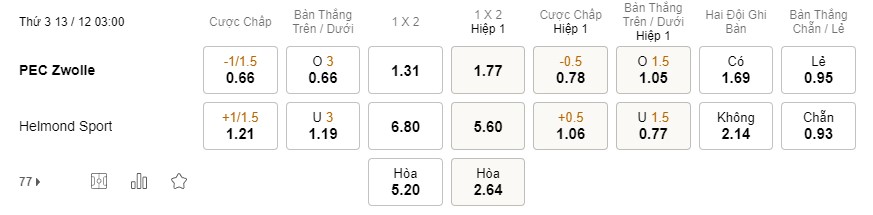 Tỉ lệ kèo Zwolle vs Helmond